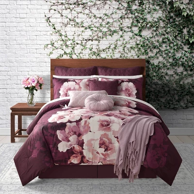 Add romantic flair with the Liana Oversized Floral comforter set. As if painted on a canvas, the florals come alive on a rich purple hued background to accommodate any sweet slumber. Includes a cozy knit throw.