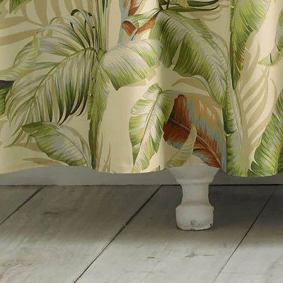 Whether you live on the coast or only dream about it, the Palmiers cotton shower curtain from Tommy Bahama offers you the ultimate in island elegance for your bathroom décor. Dramatic tropical foliage is printed on an ivory canvas with deep greens, neutral tones and a coral accent, creating a look that is both relaxed and visually dynamic. A coordinating cotton bath rug and embroidered towels complete the look. Machine washable for easy care.