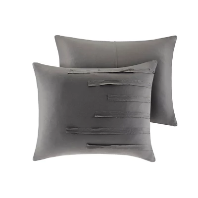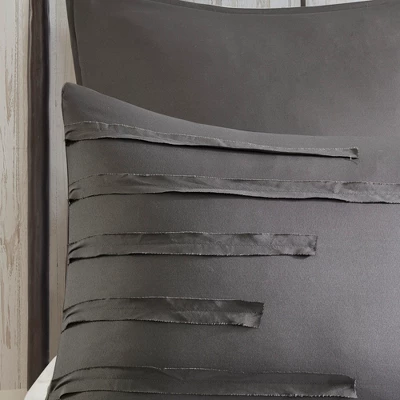 Bring a casual farmhouse look to your bedroom décor with the 510 Design Jenda 8 Piece Comforter Set. The dark grey comforter and shams feature raw edge ribbon detailing that add dimension and texture to the top of the bed. Matching solid grey Euro shams complement the casual bedding set, while decorative pillows with embroidery and pleated details provide elegant accents. A solid grey bed skirt completes the bedding set to give it a clean finish. Made from ultra-soft microfiber with hypoallergenic filling, this farmhouse comforter set is machine washable for easy care. The microfiber bedding set may come in rolled or compressed packing and will need to be fluffed up. Use a steam iron to help remove wrinkles easier.