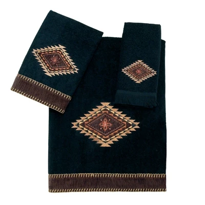 With its intricately embroidered Aztec motif and coordinating whip-stitched fabric border on the bath and hand sizes on a 100% cotton (exclusive of embellishment) black velour towel, the Avanti Mojave Black 3-Piece Decorative Towel Set brings the beauty of the southwest home. Set includes one each of bath, hand and fingertip towel. Embroidered and sewn in the US, imported materials.
