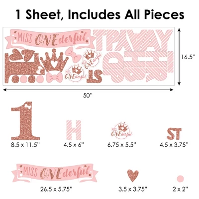 1st Birthday Little Miss Onederful Wall Decals Backdrop includes 1 sheet of vinyl wall stickers that include letters and shape pieces that form the perfect Happy Birthday backdrop for your Girl First Birthday Party. Wall Decal sheet measures 50 inches wide by 16.5 inches tall. Pieces range in size from 26.5 x 5.75 inches to 2 x 2 inches. Effortless Decor: The 1st Birthday Little Miss Onederful stickers are an easy DIY party decoration that will make a big impact at your celebration. Stick them on a flat wall surface to create that picture-perfect setting and then grab your camera to capture all the fun. Easy to Use: 1st Birthday Little Miss Onederful vinyl decals are easy-to-peel and repositionable. Wall art stickers will adhere to various surfaces including painted walls, plastic, wood, glass, and metal. To use, make sure your surface is clean and dry. Slowly peel the sticker from the paper to avoid tearing and smooth over with your hand. They are also easy to remove, leaving no residue. High-Quality Supply: 1st Birthday Little Miss Onederful wall stickers come with a quality matte finish and vibrant colors. They are printed on water-resistant professional quality material and will arrive on one full sheet rolled. Made In The USA: 1st Birthday Little Miss Onederful Wall Decals are designed and manufactured at our Wisconsin facility using materials that are Made in the USA. 1st Birthday Little Miss Onederful Vinyl Stickers uses a No-Mess Glitter Print: Our vinyl stickers are designed with a printed image of glitter, eliminating glitter flake while maximizing bling effect!