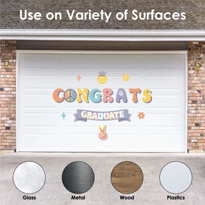 Groovy Grad Wall Decals Backdrop includes 1 sheet of vinyl wall stickers that include letters and shape pieces that form the perfect Congrats backdrop for your Hippie Graduation Party. Wall Decal sheet measures 50 inches wide by 16.5 inches tall. Pieces range in size from 30 x 6.5 inches to 3.25 x 3 inches. Effortless Decor: The Groovy Grad stickers are an easy DIY party decoration that will make a big impact at your celebration. Stick them on a flat wall surface to create that picture-perfect setting and then grab your camera to capture all the fun. Easy to Use: Groovy Grad vinyl decals are easy-to-peel and repositionable. Wall art stickers will adhere to various surfaces including painted walls, plastic, wood, glass, and metal. To use, make sure your surface is clean and dry. Slowly peel the sticker from the paper to avoid tearing and smooth over with your hand. They are also easy to remove, leaving no residue. High-Quality Supply: Groovy Grad wall stickers come with a quality matte finish and vibrant colors. They are printed on water-resistant professional quality material and will arrive on one full sheet rolled. Made In The USA: Groovy Grad Wall Decals are designed and manufactured at our Wisconsin facility using materials that are Made in the USA.