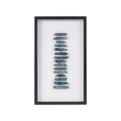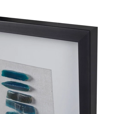 Elevate your home decor with the bold style of our Martha Stewart Cerulean Stones Framed Blue Agate Shadowbox Wall Decor Panel. This shadow box wall art features 100% genuine agate stones that are uniquely cut and placed under glass, for a opulent and modern look. Each stone is carefully arranged on a single matte base creating a gallery look and feel, while the Black MDF frame adds a striking complementary and updated touch to the design. The reverse features 4 D-rings, making it easy to hang this framed wall art either vertically or horizontally fitting to any decor or space. Colors and shapes of agate may vary from image due to the natural properties of each agate stone, making each piece exclusively unique.