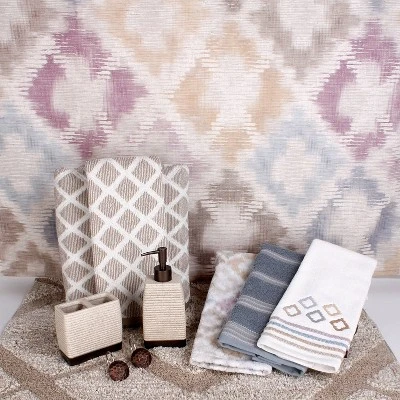 A rustic modern diamond design with cross hatch features sets the Davidson fabric shower curtain by SKL Home apart from the crowd. The painterly watercolor look design is printed on a textured cotton and linen blend fabric. Add contempoarary elegance to your bath decor with the Davidson bath ensemble by SKL Home.