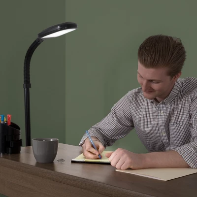 Work on crafts and sewing projects with ease by using this Hastings Home Daylight LED Floor Lamp. The 17W bulb gives out a natural brightness that helps reduce eye fatigue, and with a touch of a button, you can shift to any of four dimming levels for the desired brightness. The bendable neck lets you adjust the light where you need it, and the black minimalist design complements any home, office, or hobby area.