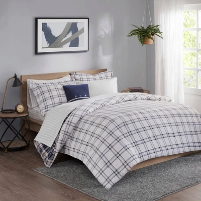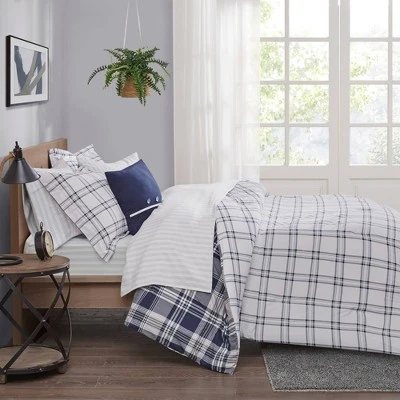 Restyle your bedroom with the Leroy Reversible Complete Bedding Set. The reversible comforter and shams (1 in Twin Sizes) feature a plaid print on the face and a white plaid print on the reverse, for a charming casual look. A coordinating square decorative pillow adds a finishing touch to the comforter. Also included is a sheet set, complete with a flat sheet, fitted sheet, and 2 pillowcases (1 for Twin Sizes). Bringing the best in health and wellness, this bedding set also features an anti-microbial treatment that provides built-in freshness protection, reducing the growth of odor causing bacteria and keeps fabric lasting longer. This bedding set is also OEKO-TEX certified, meaning it does not contain any harmful substances or chemicals, ensuring quality comfort and wellness.
