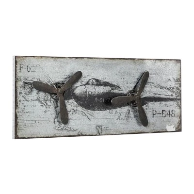 - Features a rectangular industrial themed decor with a large galvanized iron slab with a vintage airplane diagram reading "A-21/7" on its side and three dimensional propellers