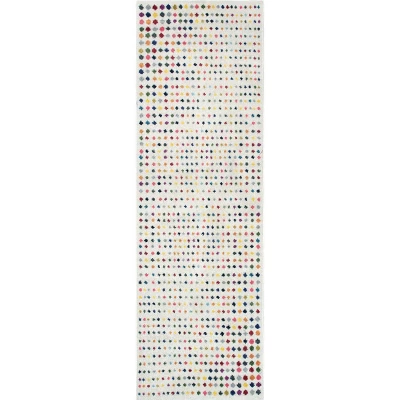 Add a pop of color to your childs room with this polka dot area rug. Made from durable synthetic fibers, this floor covering is built to last while remaining soft underfoot. Place this rug in your nursery or kids playroom and will pair with any of your existing décor. Create the home youve always dreamed of with our easy to care for and pet-friendly area rugs.