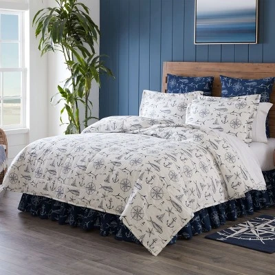 - The Captain Quarters King Sham coordinates great with your nautical theme bedroom decor. This maritime sham features a high quality cotton fabric on a white background with nautical designs of lighthouses, anchors, and fish in a deep navy hue.