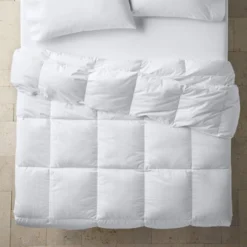 When cooler weather settles in, keep things warm and cozy with the Ultra Weight Down-Blend Comforter from Casaluna™. This ultra-cozy comforter is generously filled with a blend of duck down and polyester for an inviting addition to any bedscape, and the 100% cotton outer has a soft finish for an appealing feel. A box-quilted design helps minimize shifting for even weight and distribution throughout. The ultra-weight construction is the loftiest, most luxurious choice, with a cloud-like silhouette and comforting weight that feels extra cozy on cool nights. Thoughtfully designed, it will keep you resting easy all through the cooler seasons.